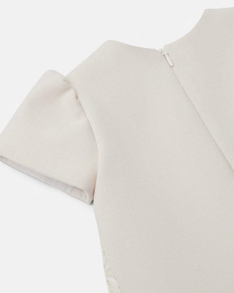 Expertly designed for the discerning parent, this Versace shift dress combines refined tailoring with playful sophistication. The supple beige Milano-stitch jersey provides gentle comfort and natural drape, while tonal Barocco printed inserts add visual depth and designer flair. Signature Medusa snap buttons serve as both functional closures and distinctive style accents. Perfect for special occasions or elevated everyday wear, this piece balances timeless elegance with modern sensibility.