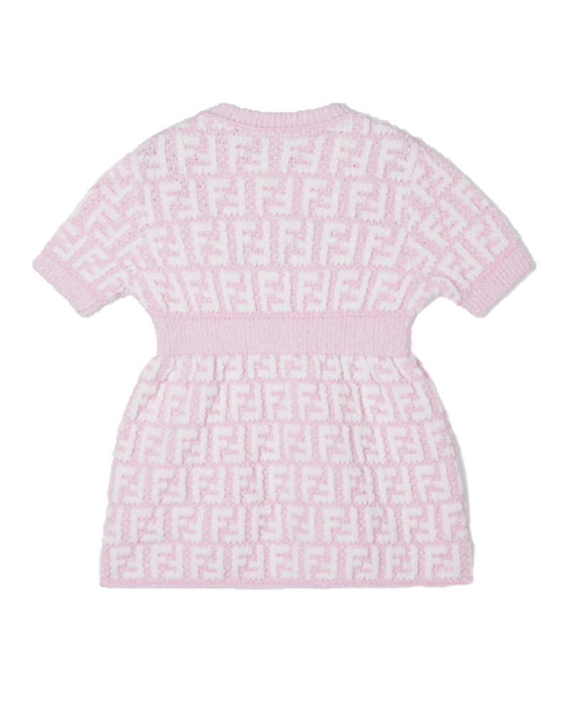 Soft cotton knit construction meets timeless design in this baby girls Fendi dress, featuring an all-over FF logo pattern in contrasting pink and white. The breathable fabric ensures comfort throughout the day, while the classic logo print adds a touch of designer sophistication. Perfect for everyday wear or special occasions, this dress combines quality craftsmanship with playful style for the modern little one.