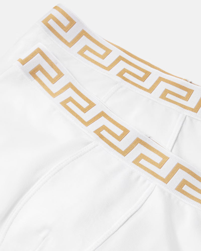 Crafted from soft cotton jersey, this two-piece Versace boys boxer set combines comfort with refined detailing. Each trunk features a distinctive jacquard Greca border along the elastic waistband, adding a touch of sophistication to everyday essentials. The breathable fabric ensures all-day comfort for active boys. For optimal hygiene, we recommend trying on with personal underwear underneath.