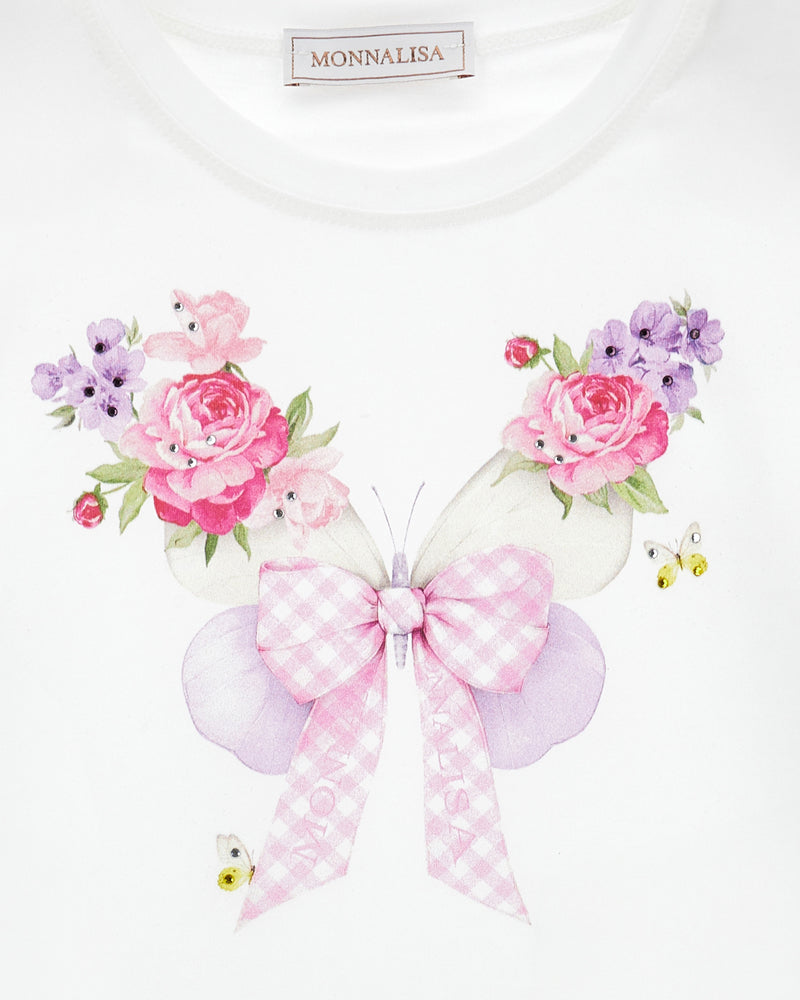 Elevate her casual wardrobe with this Monnalisa girls white butterfly t-shirt. Featuring a delicate butterfly print on the front, this piece combines timeless elegance with everyday comfort. The versatile white base pairs effortlessly with jeans, skirts, or shorts, making it an essential layering piece for spring and summer. Crafted with quality construction, it's designed for active play and relaxed moments alike. A sophisticated choice for young fashion enthusiasts who appreciate refined, understated style.